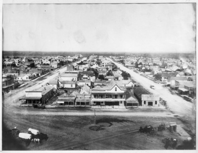 Fort Worth City of Street Scenes View from top of the Tarrant County Courthouse looking east ca. 1888. On the middle right of the photo there is a building labelled "BlackSmith Shop". Cover wagons with horse are be seen towards the foreground of the photo.