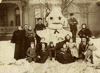 Snow scene, family with snowman at 1004 Lamar St., Fort Worth; property of the Knights of Columbus; surnames of families represented are Fonte, Cheatham, Farris, Phillips, and Wallace (of Waples Platter grocers).