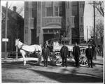 Fort Worth Fire Station No. 1, at 3rd and Rusk (today, Commerce) St.; fire truck with white horses and firemen standing out front, 1890s