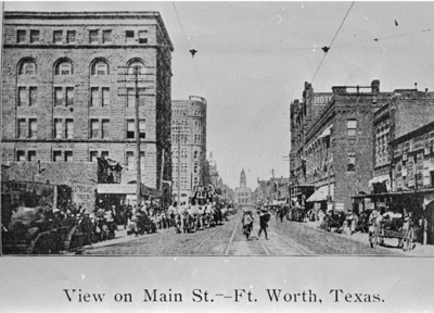 View on Main Street, Fort Worth, looking north towards court house, undated [circa mid-1890s -- Farmers and Mechanics Bank in the Hurley building is on the left which burned in 1898].