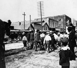 Children follow a circus parade down Main Street, Fort Worth, Texas.