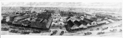 Skyline drawing of old Fort Worth with horse-drawn carts and horse-drawn trolley in the streets, ca. late 1800s