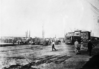 horse-drawn wagon; Produce; electric street car; Streets; Texas & Pacific Depot
