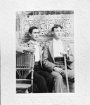 Amon G. Carter and boyhood friend (copy of old photograph, ca. 1890s). Carter and his unidentified friend are sitting on a chair with a decorative piece in the background. Both boys are wearing collared shirts with a bow tie, pants with a belt and jackets. In front of Carter is a chair and he has his hand resting on the chair's top rail. His friend is holding a stick in his hands. Both of them are looking straight ahead.