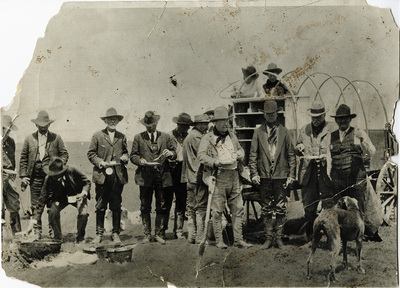 Theodore Roosevelt and a group of men are eating lunch from a chuck wagon. There is a large dog in foreground. There are large pots and kettles on the ground near to a fire. The men are all standing while they eat food from tin plates and cups. Most of the men are wearing cowboy hats.