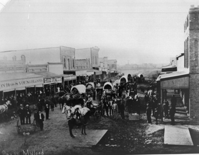 Midland, Texas, dirt main street filled with people, wagons, horses, and buildings on either side of main street 12/25/1892.