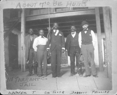 A man awaiting execution, "about to be hung" - Jim Toots with Joe McMillan, Daggett, and Phillips, in Tarrant County jail, Approximately 1895.