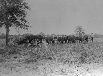 Albert Pair with 5 yoke of oxen plowing 25 acres of new ground on the G. R. Mace farm near Stephenville, Texas circa 1896