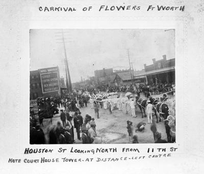 Carnival of Flowers, Fort Worth. . At the bottom of the photograph is written "Houston St looking north from 11th St Note Court House tower at a distance -left center". There is Hotel Harrold on left, ca. 1897 [copy photo taken 6/13/1951]