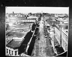 Early photograph of old Fort Worth, looking north on Main Street with Tarrant County Courthouse at the end, ca. late 1890s