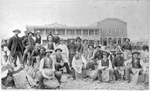 Stone masons building Parker County Courthouse in Weatherford; Carson-Lewis House and Hayne Opera House in background, 1884