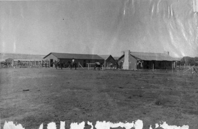 Bar CC Ranch (or the Cresswell Ranch), 1886; 3 men identified, two on horses, left to right, Ed Brainerd and Mac Yates; one man standing on porch is Dave Lard