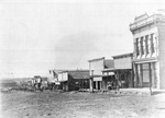 Sweetwater, Texas 1887, dirt streets lined by various shops and hotel, horse drawn buggies gathered at end of street
