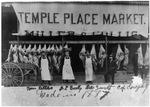 Temple Place Market; four men standing in front of hanging beef, 1887; men's names are illegible.