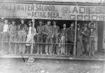 Sweetwater, Texas, 1893. Twelve men and a dog standing on porch of the Sweetwater Saloon. The sign reads "Sweetwater Saloon & Retail Beer, 5 cents" and to the right there is a sign that is partially visible and includes with words "Ladies" and "Goods."