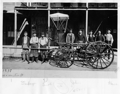 J.C. Jahns Blacksmith Shop, 8th and Houston, downtown Fort Worth; men identified include Eilenberger, Ed Lenox, Johns, and Hass, 1895