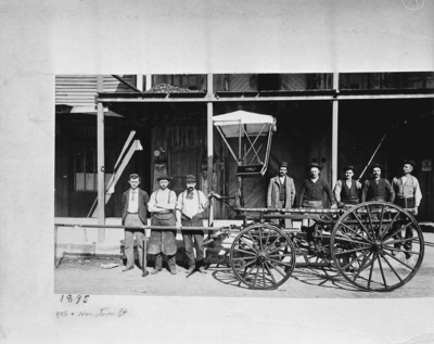 Copy of photograph of a group of men standing with a Texas Brewing Company cart in 1895, at the corner of 8th and Houston Streets, Fort Worth, Texas.