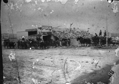 An old street scene in Weatherford, Texas will remind many West Texas cattlemen of the days when wagons hauled hides into Crowdus Brothers on North Main Street, ca. mid-1870s. Pictured is the Weatherford branch of Crowdus Brothers. The wagons hauled the hides from this branch to the company in Fort Worth, Texas. Buffalo Hides are drying on the roof of the building. Horses and wagons are parked out front.