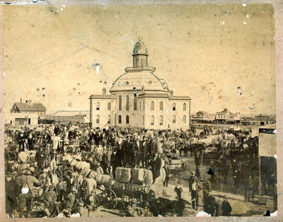 Third Tarrant County Courthouse (built after second one burned in 1876) looking east toward jail and Masonic Hall with belfry, ca. 1878-1882