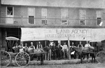 Land Agency of E.B. Daggett in the Clark Hotel Building; first 3 unidentified, Tyler, J.E. Martin, Jeff Earl, Sam Evans, H.T. Music, E.B. Daggett, [?] Dugan, G.W. Alexander, last man unidentified, ca 1880