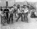 Three circles of cowboys dancing, man playing fiddle, chuckwagon in background; may be Bar S Ranch, n.d. [Approximately late 1800s?].