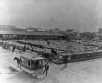 Boaz & Battle Cotton yard and cotton gin; mule-drawn street car and men on horseback, Fort Worth, ca 1881