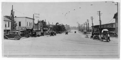 Fort Worth street scene, Morgan & Huston Body Works, Cascade Laundry, 605-07 West Railroad Ave (present day 509 W Vickery Blvd), on left, 09/08/1923