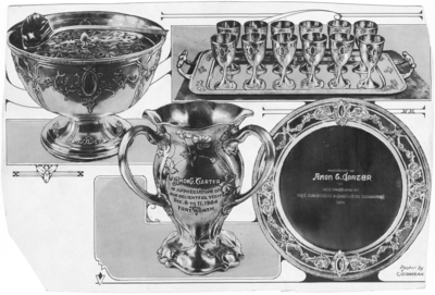 Gifts to General Chairman of the 1924 API Convention. The upper images show the punch and flower bowl, the tray and goblets, and part of the silver service presented to Amon G. Carter, chairman of the committee in charge of arrangements and entertainment for the American Petroleum Institute convention held in Fort Worth December 8-11, 1924, on behalf of the board of directors of that organization. The image on the lower left shows the loving cup (which reads "Amon G. Carter, in appreciation of our delightful visit, Dec. 8 to 11, 1924, to Fort Worth") presented by brothers L. E., Frank, and Waite Phillips, and on the right is the large tray, also a part of the silver service given by the API directors.