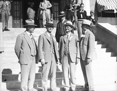 Amon G. Carter, far right, with three unidentified Texas & Pacific officials. The four men are standing at the bottom of a set of stairs in front of a building. Others are in the background. Carter and the Texas & Pacific officials are all wearing sutis and hats. The two men in the center are wearing eyeglasses.