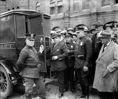 Texas & Pacific officials with police officers. Two officers are standing by a police vehicle as one of the Texas & Pacific officials steps into the vehicle. A crowd of people are standing around the vehicle.
