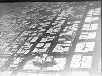 Aerial view of downtown Fort Worth after a snow storm with courthouse at bottom, looking toward south southeast, 12-21-1927