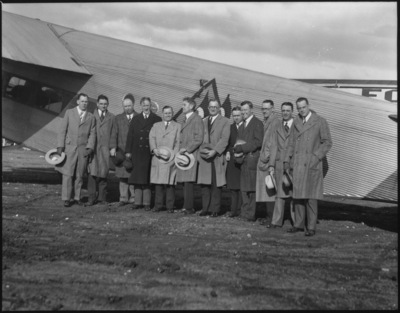 Fort Worth Chamber of Commerce holds first business meeting on an airplane; directors standing beside plane at Meacham Field, 12/19/1928