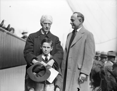 Kenesaw Mountain Landis, left, Amon G. Carter, and Amon G. Carter, Jr. at a baseball game between Chicago White Sox and Fort Worth Cats.
