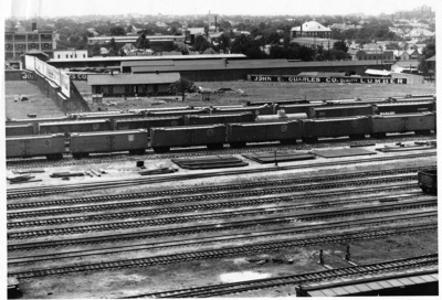 Texas & Pacific railway yards with John Quarles Lumber Co. in background, 05/11/1929