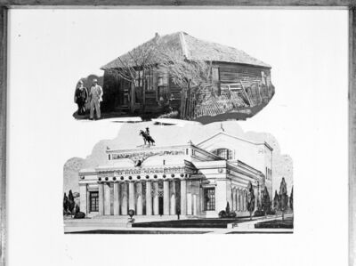 Copy photos of home of Tex Rickard in Henrietta, Texas, and illustration of Rickard's proposed memorial.