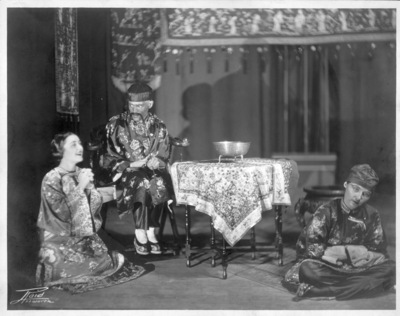 Sweetmeat Game, presented by the Vagabond Players, Fort Worth's first organized Little Theater group, in 1921. left to right: Marguerite Kerr (Hamilton), Walker Moore, and Rosalind Gardner (Shelley).