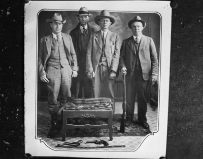 1927 Cisco Bank Robbery; four lawmen who caught Robert Hill and Henry Helms in Graham, Texas on 12/30/1927; from left, Gentry Williamson, Walter Sikes, Elmer H. Little, and Jim Davis. Four men are shown here standing side by side holding the tips of rifles as a cane. Each men have on a suit and hat.