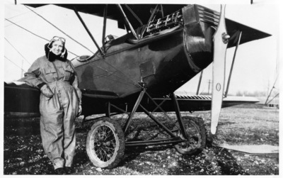 Pilot Edna Gardner standing beside OX-5 Swallow T.P. Trainer plane, place not identified, 1928