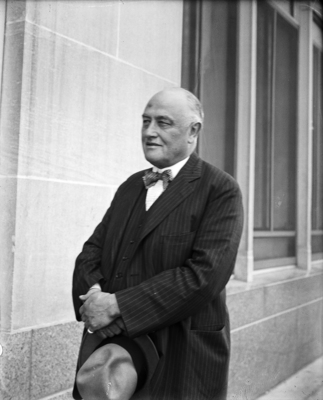 Louis F. Swift, president of the meat-packing business Swift & Company. Swift is standing on a sidewalk, wearing a pinstripe suit.