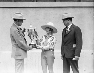 Amon G. Carter, left, and Tad Lucas, center, holding the Gordon Selfridge Trophy for All Around Champion Cowgirl that Lucas won in 1929, with Jno Davis looking on at right; 03/10/1930.