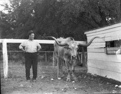 Longhorn steer with man on Shady Oak Farm, 03/05/1930