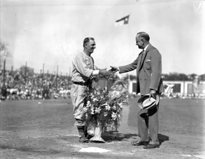 Amon G. Carter, right, shaking hands with Jake Atz, former Fort Worth Panthers baseball team manager, at LaGrave Field in Fort Worth. Atz is seen presenting an arrangement of flowers to Carter. The Texas state flag is seen flying in the background.