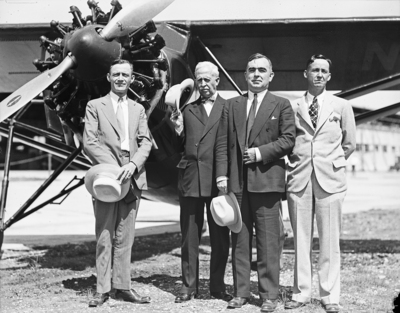 J. C. Penney with others at the airport (possibly Meacham Field). Four men are standing in front of an airplane.