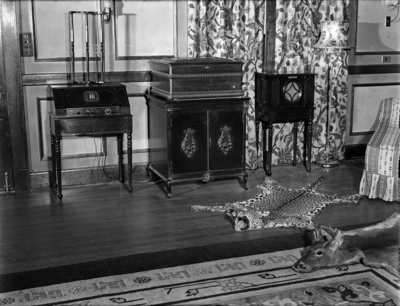 Shady Oak Farm interior views. In the room is a radio, a cabinet, a lamp and animal skin rugs.