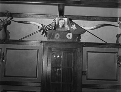 Shady Oak Farm interior views. On the walls are animal décor (mounted horns and animal heads). Above a doorway is a sign that reads, "Howdy," and a portrait of an unidentified man.