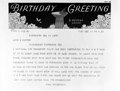 Copy photo of birthday telegram sent to Amon G. Carter from Paul Henderson, president of National Air Transport, Inc. Telegram postmarked December 11, 1930, copy photo taken May 30, 1931.