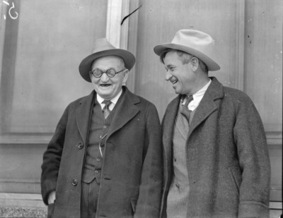 W. T. Waggoner and Will Rogers (right) at Arlington Downs, January 24, 1931.