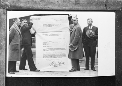 Copy photograph. From left: Paul Henderson, R. W. Ireland, Amon G. Carter, and Will Rogers posing with a giant letter congratulating National Air Transport Inc. on the first air passenger ship from Fort Worth, Texas, to Chicago, Illinois. Two men are standing to the left of the giant letter while the other two men are standing to the right. The letter, the first National Air Transport mail shipment, was sent as a gift on behalf of the Fort Worth Chamber of Commerce from Paul Henderson, president of National Air Transport, Inc.