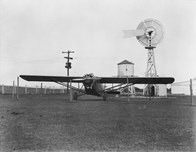 National Air Transport (N. A. T.) plane upon its arrival at Shady Oak Farm. In the background is a windmill, a telephone pole, and a barbed wire fence.
