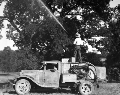 Rock Springs in Trinity Park. A man holding a hose is standing on the back of a water truck.